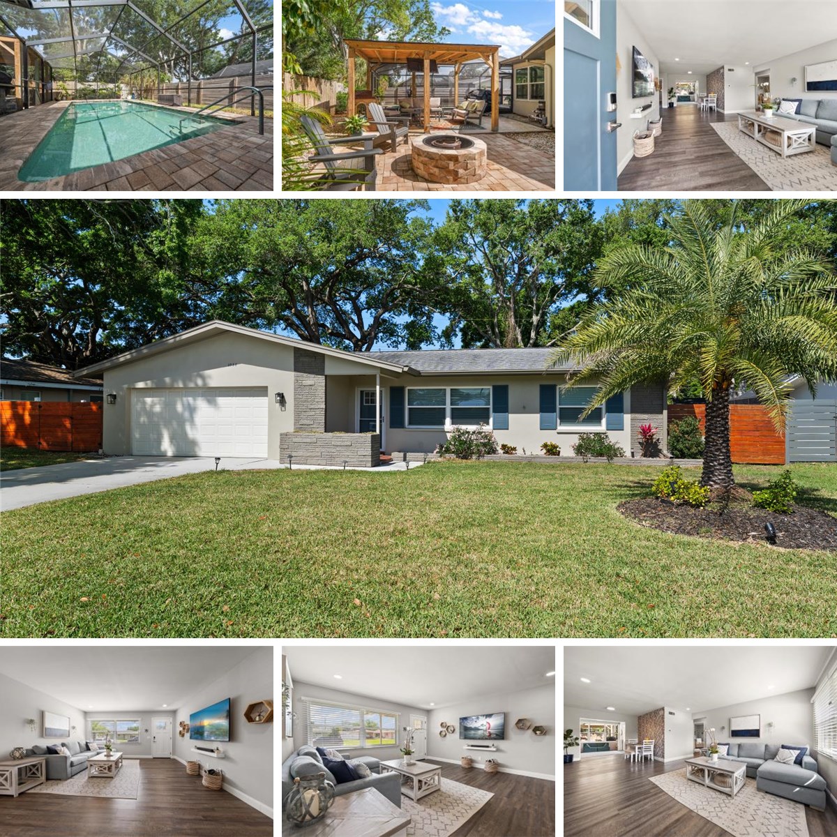 Nestled within the sought-after Fairway Estates community in Dunedin, this beautifully and extensively renovated pool home captures the essence of effortless Florida living. From the moment you arrive, you’re welcomed into an open-concept design filled with abundant natural light, where every detail has been thoughtfully updated—from new doors and flooring to upgraded plumbing and a whole-house water filtration system. At the heart of the home, a stunning new kitchen showcases timeless white shaker-style cabinetry, gleaming granite countertops, and a layout designed for both everyday living and entertaining. The desirable split-bedroom floor plan offers privacy and comfort, highlighted by a spacious primary suite featuring a custom closet and direct access to the pool. The ensuite bath is elegantly appointed with a granite-topped vanity and a large walk-in shower, creating a spa-like retreat. Additional bedrooms are equally inviting, offering generous closet space and sharing a beautifully renovated hall bath with a tub/shower combination. A versatile flex room (not included in the heated square footage) would be ideal as a home office, playroom, or bonus space—extends your living area and leads seamlessly to the outdoor oasis. Here, an enclosed pool and patio with new pavers invite relaxation, while a covered pergola and built-in firepit set the stage for unforgettable evenings under the stars. Lush green space and mature trees surround the home, adding to the sense of privacy and tranquility. Additional features include an outdoor shower and a customized two-car garage complete with built-in cabinetry, dedicated tool space, and overhead storage. Located in a golf cart-friendly neighborhood, you’re just a short ride from charming downtown Dunedin and the historic Dunedin Golf Club, originally designed by Donald Ross, close to shopping, restaurants, Honeymoon Island State Park and Caladesi Island, making this home not just a place to live, but a lifestyle to love.